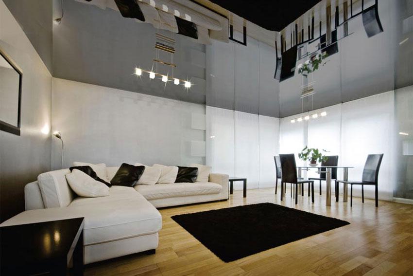 Конструкции такого вида пользуются оправданной популярностью в связи с высокой отражающей способностью. Лаковые натяжные потолки не только расширяют помещение, придавая ему дополнительный визуальный объем, но и делают дизайн комнаты более благородным. Материал, применяемый при монтаже, хорошо подойдёт рабочему помещению или конференц-залу, где необходима сдержанность и функциональность. Также он будет уместен в небольшой жилой комнате или детской, где предпочтение отдаётся свободе и оригинальности.