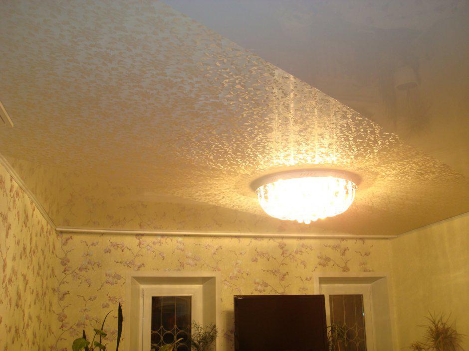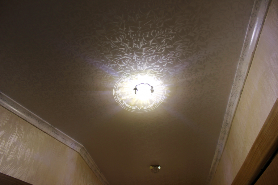 - Богатство узоров. На парчовых натяжных потолках одинаково уместны и мелкие фактурные элементы, и складки по всей поверхности, и потёртости возле люстры, вносящие разнообразие в зону освещения.