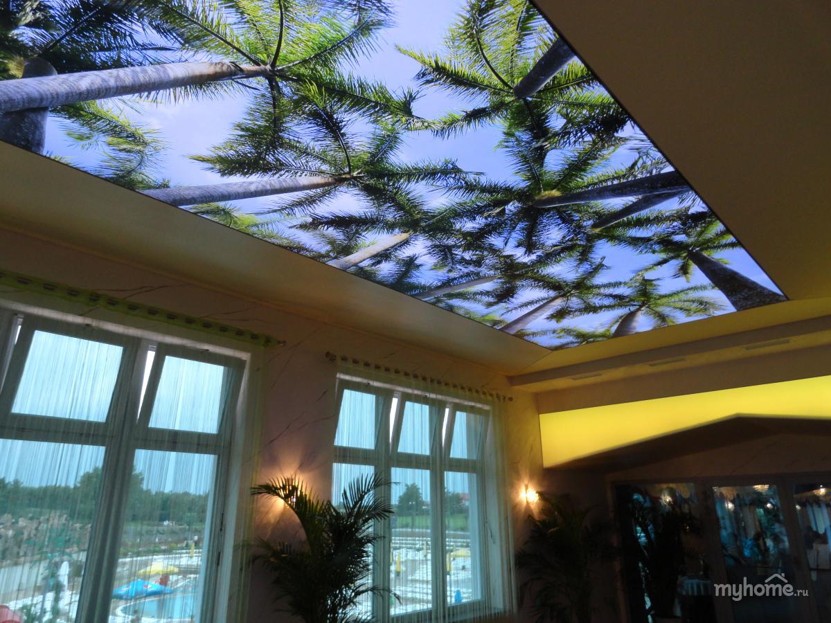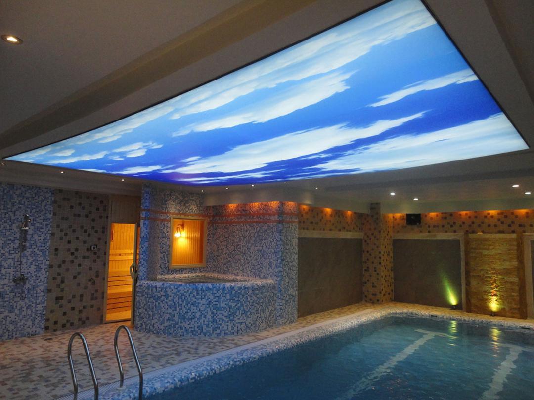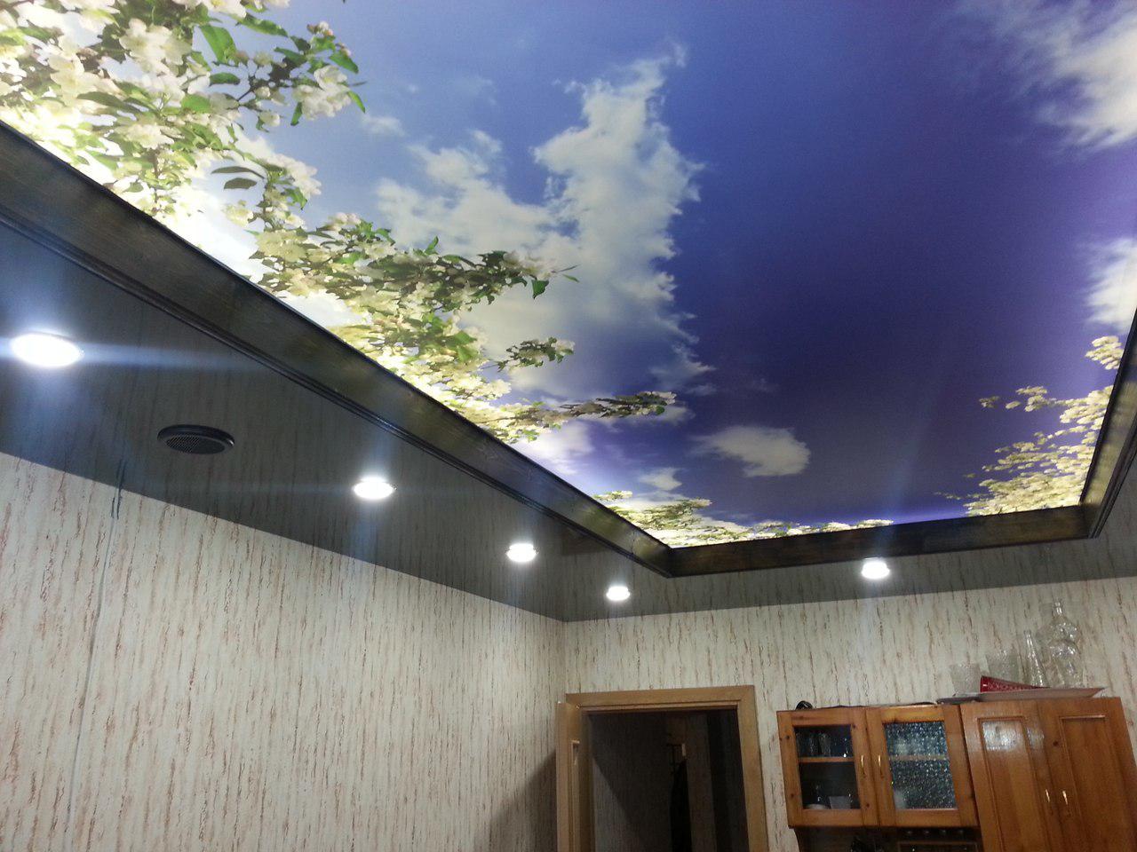 Эффект трехмерного изображения, создаваемый натяжным потолком будет особенно заметен при правильном освещении. Оправданной популярностью пользуется контурная диодная подсветка и точечные светильники средней мощности.
