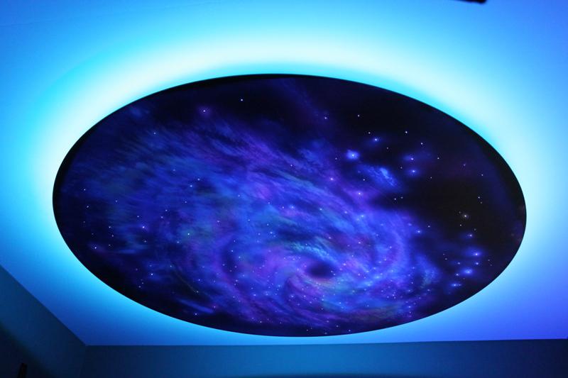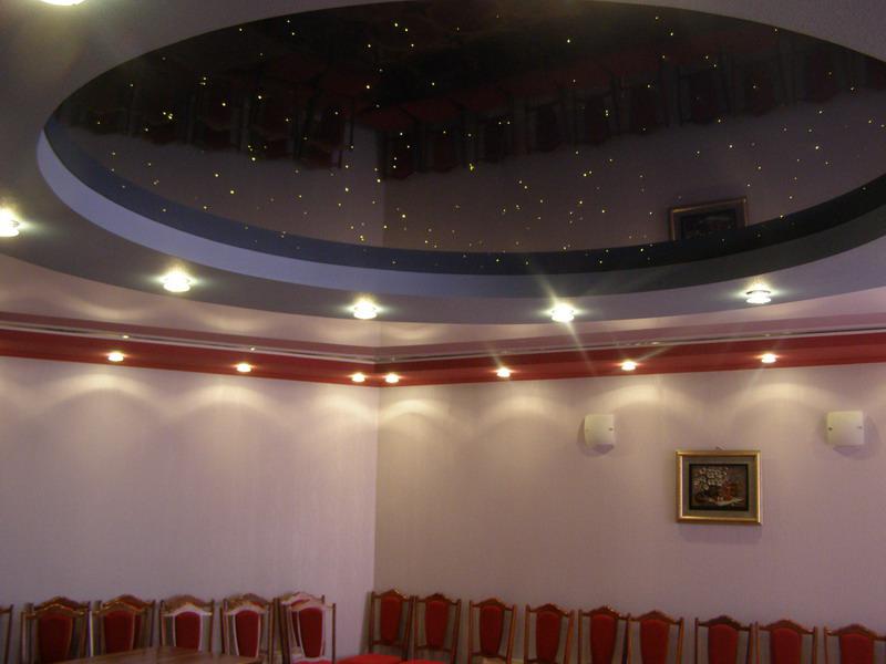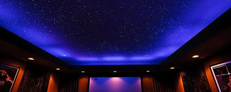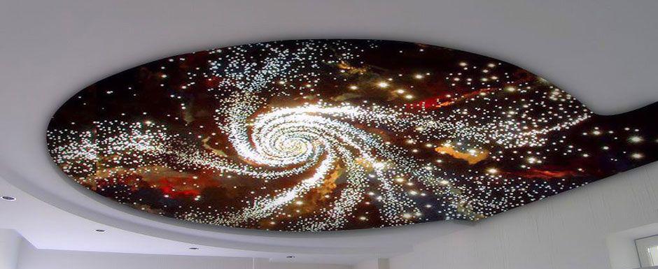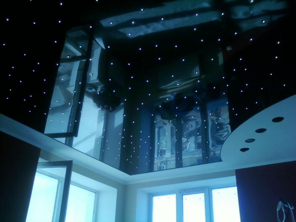 Такие натяжные потолки отличаются мягким свечением и используются как вставки в определенные области. Если Вы хотите усилить эффект и добиться большей реалистичности, то можно установить звезды-светильники. Такой потолок подходит не только для спален и детских, но и для больших танцполов. В зависимости от освещения, можно получить как эффект водной глади, так и глубокий, таинственный сумрак настоящей галактики.