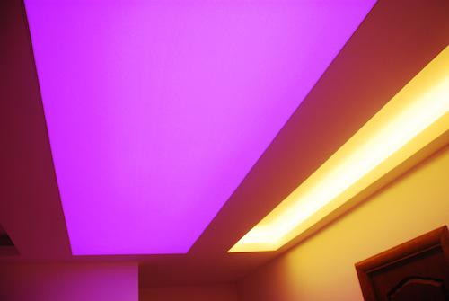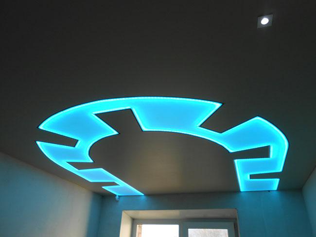 Общее впечатление от готовой конструкции существенно зависит от её освещения. Красивую засветку плоскости можно обеспечить неоновыми трубками, но для полноценного освещения их силы недостаточно. Люминесцентные светильники дадут мощный поток, но в промежутках будет присутствовать затемнение. Для минимизации указанных недостатков необходимо увеличить расстояние между источниками света или смонтировать дополнительное рассеивающее полотно.