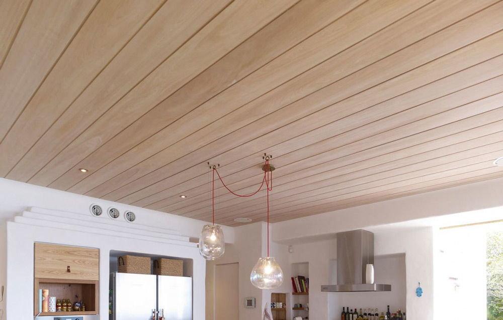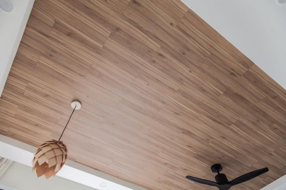 Если в вашем интерьере преобладает дерево, то можно его выгодно подчеркнуть используя этот материал. Полотно выглядит как настоящее дерево, но обладает всеми приемуществами натяжных потолков.