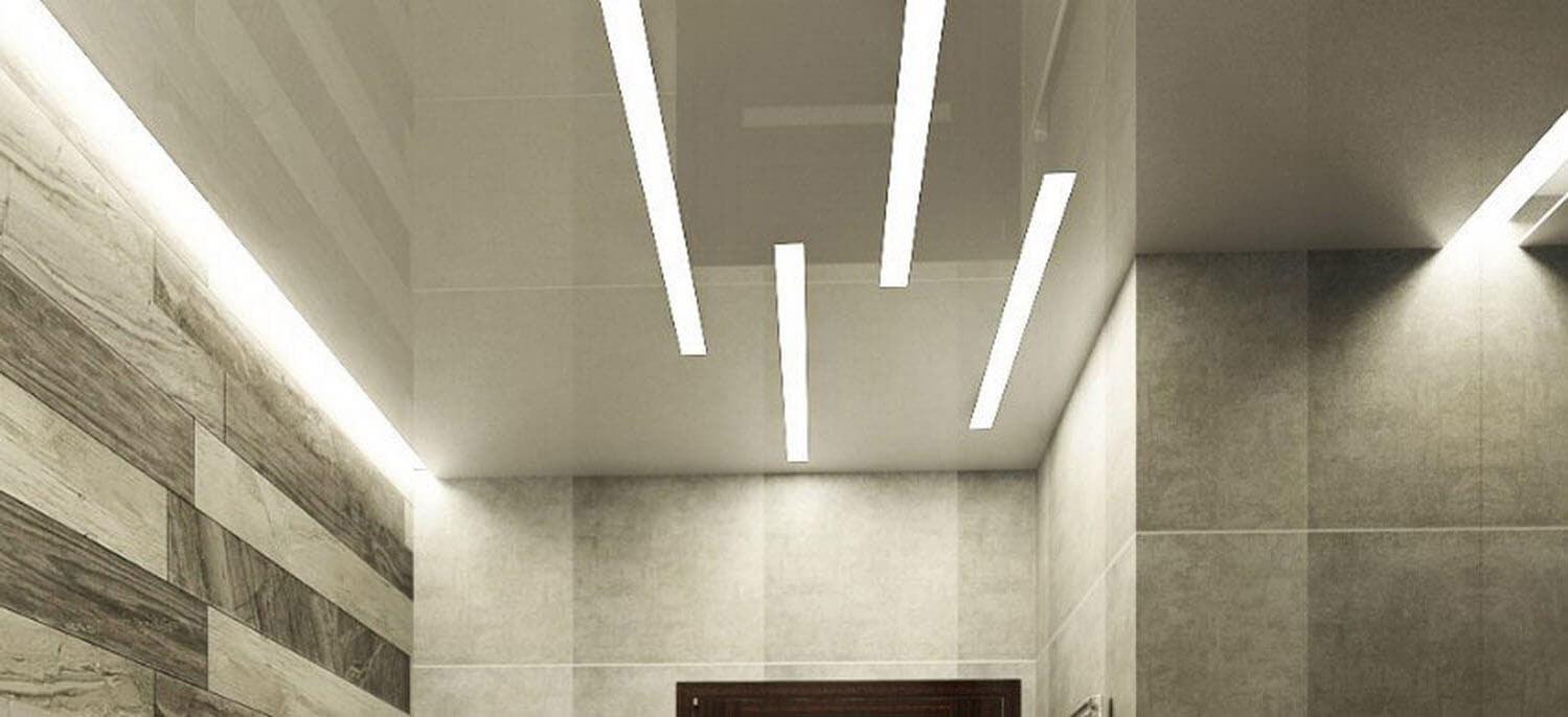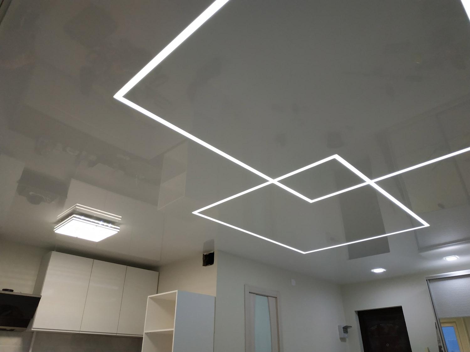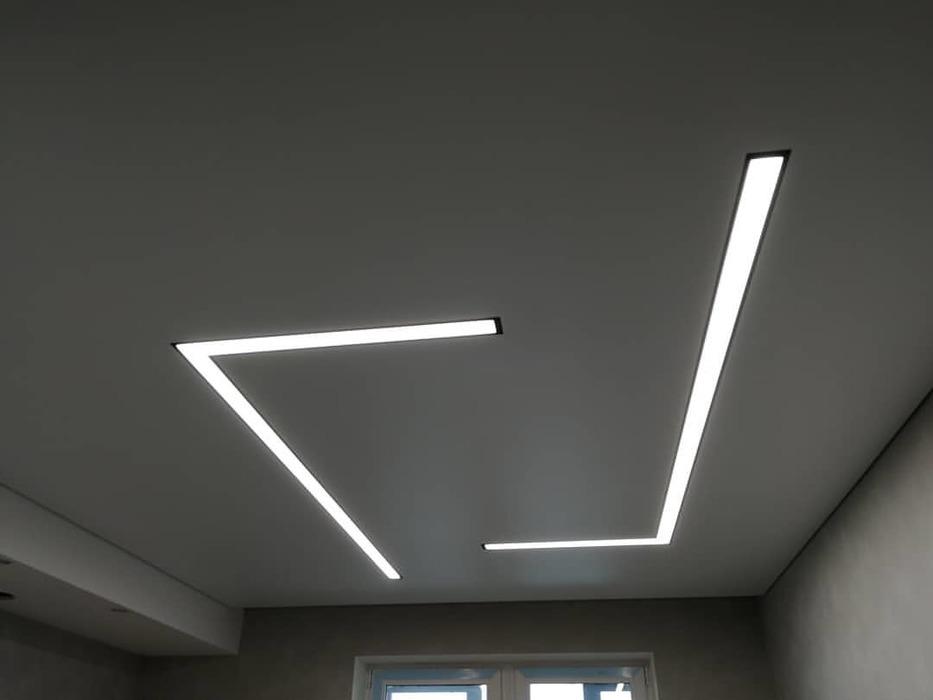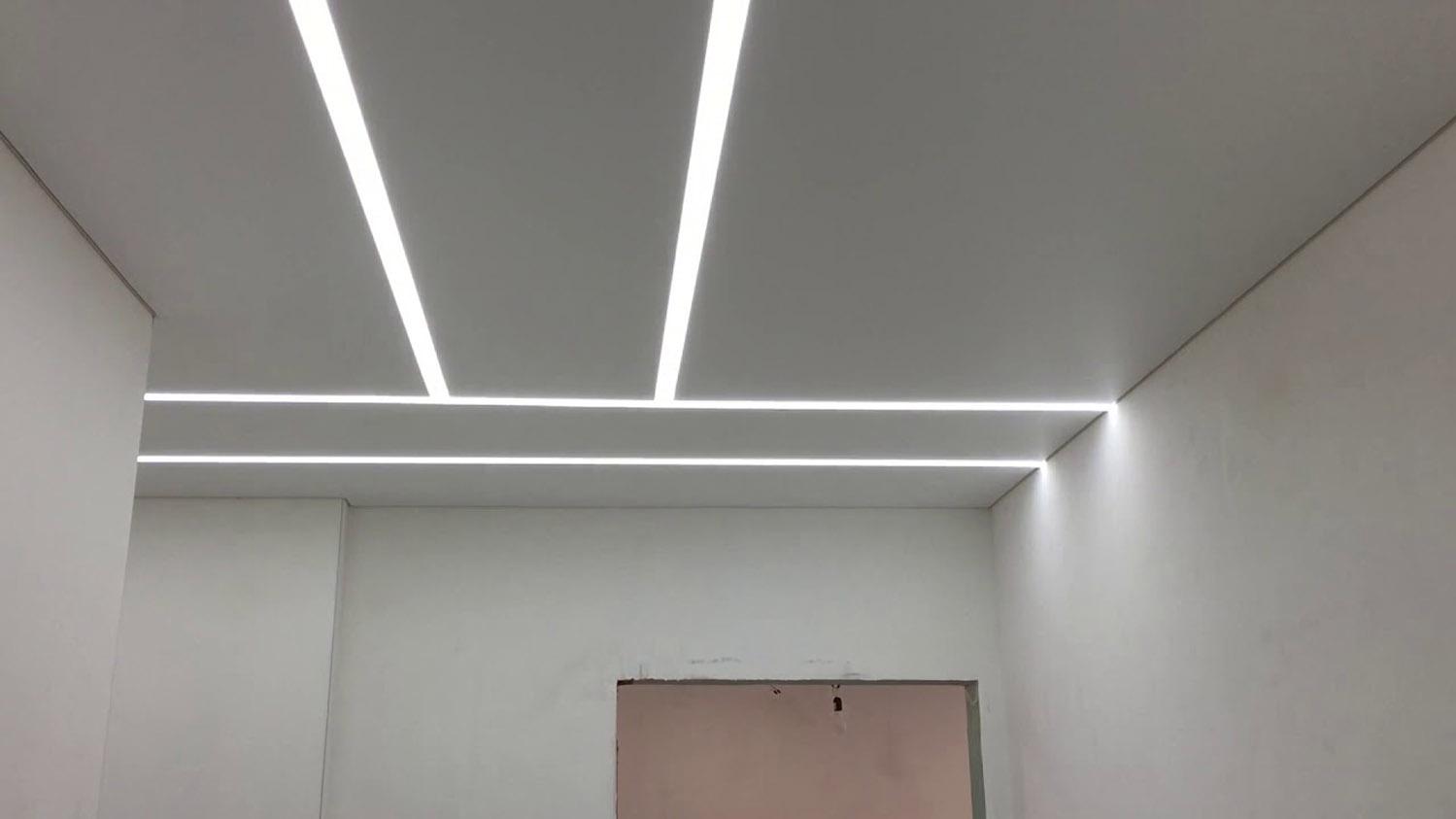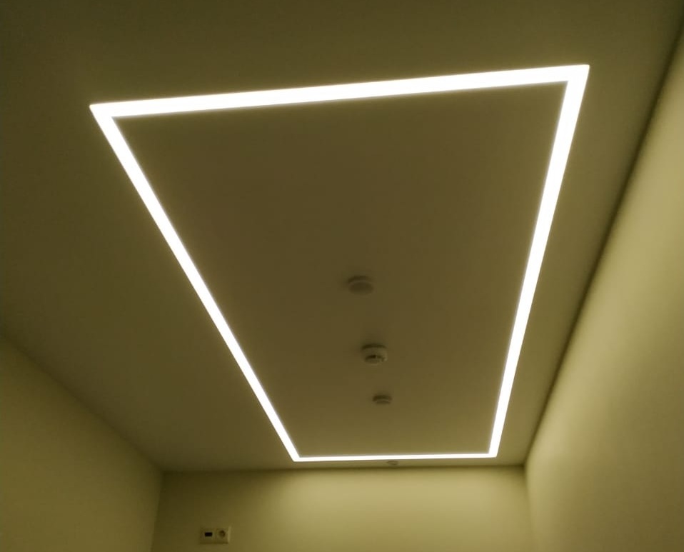 Световая линия представляет собой «короб», в который установлена светодиодная лента. Линия может быть как видимая, так, и установлена за полотном, при этом, если не включать освещение она будет не видна. Возможно ее использование, как дополнительного источника света, так и основного.
