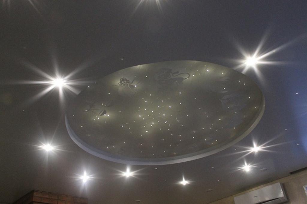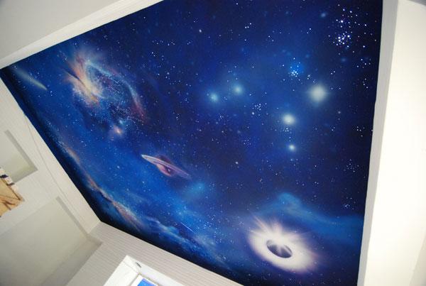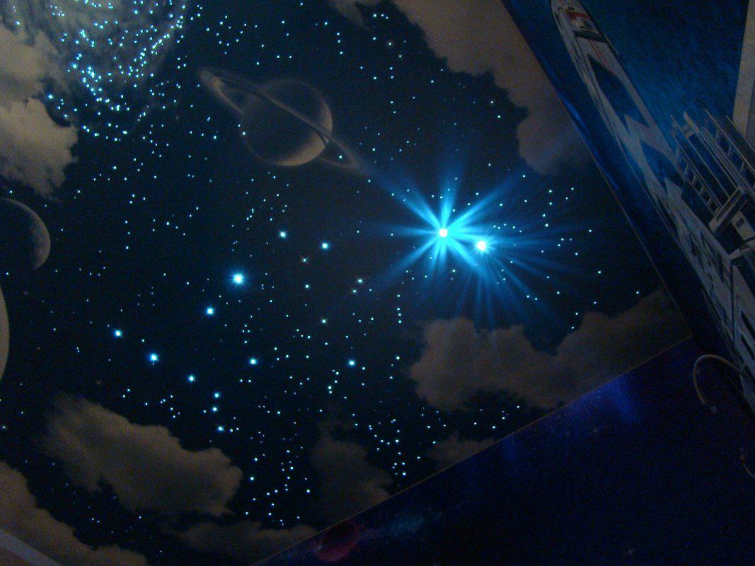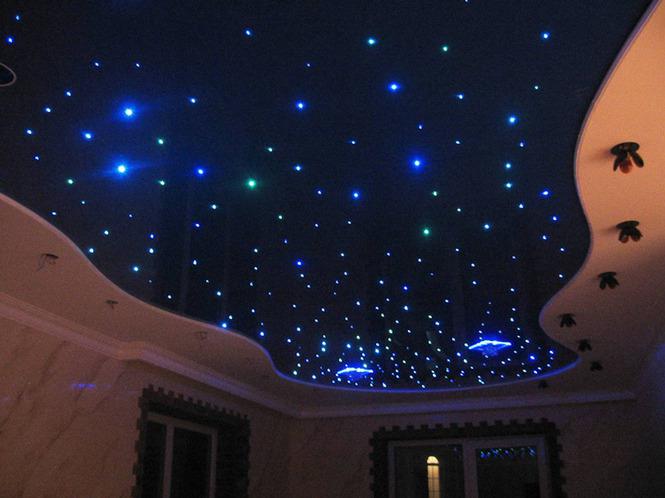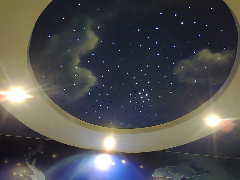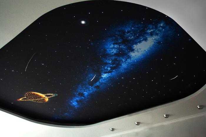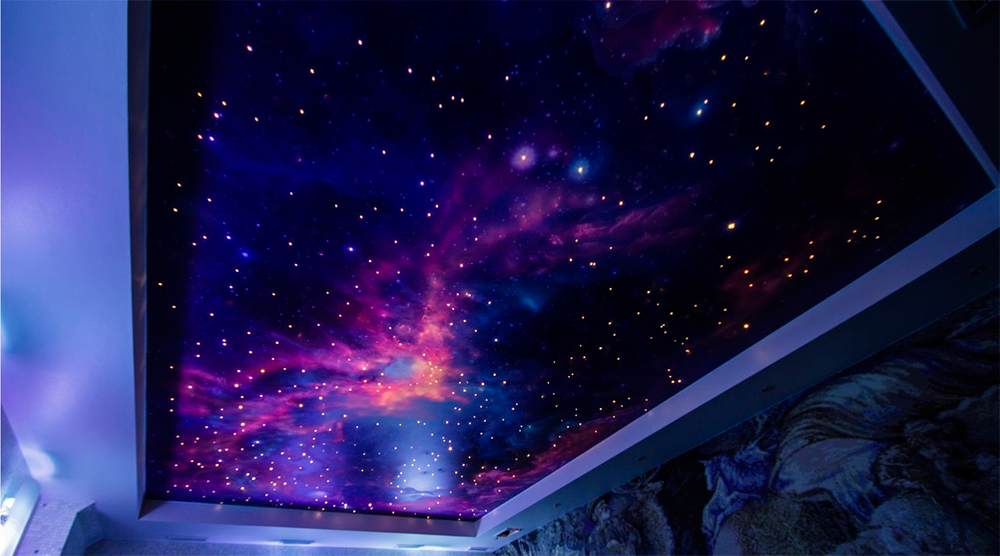 Натяжные потолки «Звёздное небо» — это настоящее произведение искусства. В зависимости от исполнения и выбранного рисунка, такой потолок может передавать как звездное небо с отдельными мерцающими звездами, так и целые галактики и созвездия. Устанавливаемая система подстветки позволяет регулировать мерцание и уровень яркости отдельных элементов так как вам будет комфортно. В качестве текстуры, как правило, используются тканевые основы.