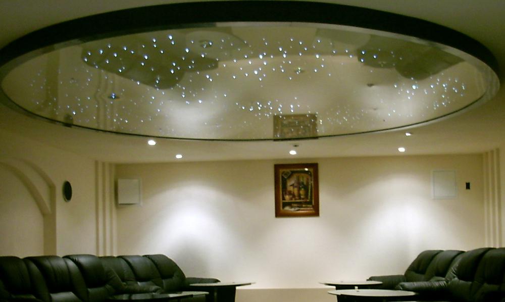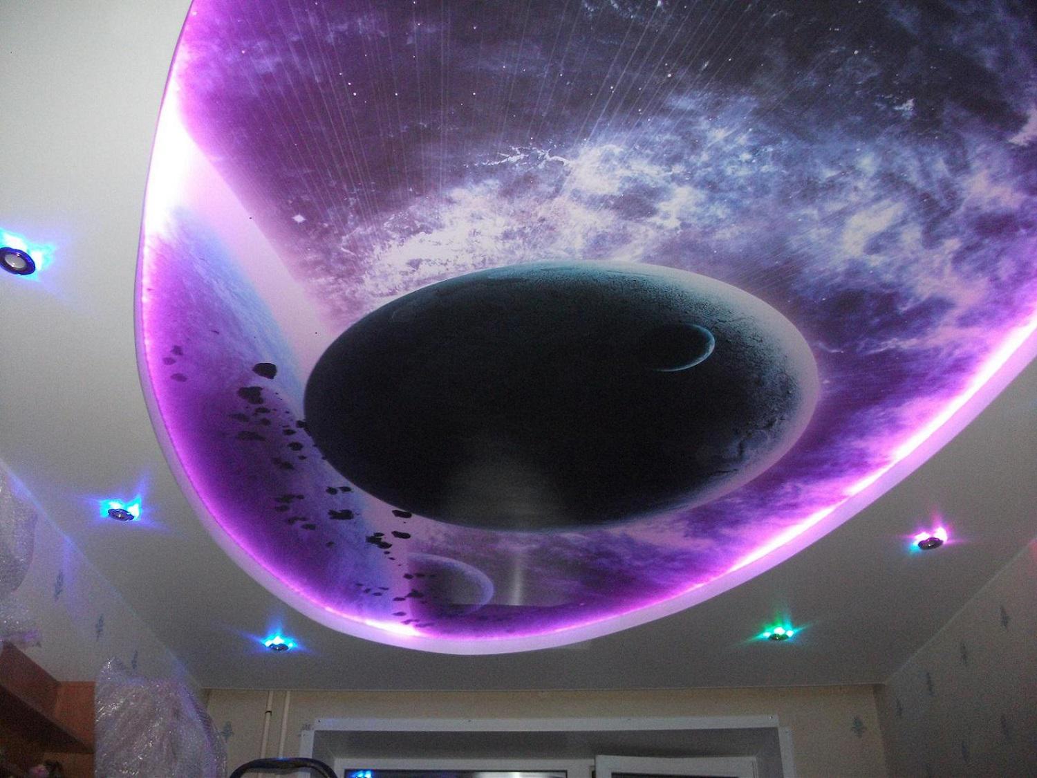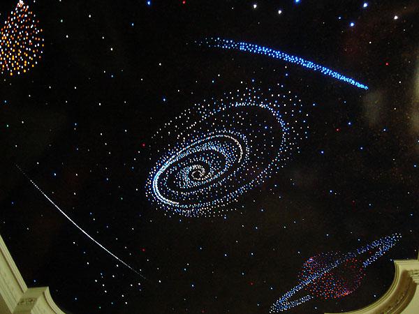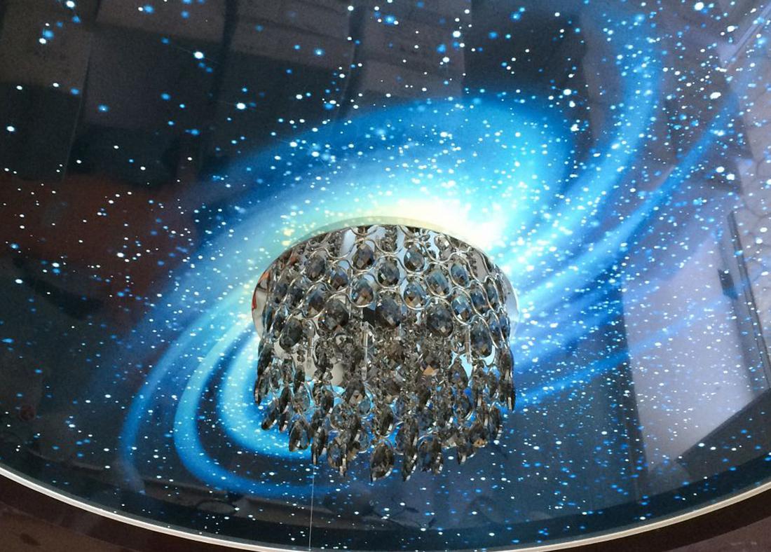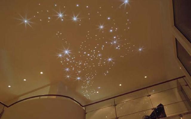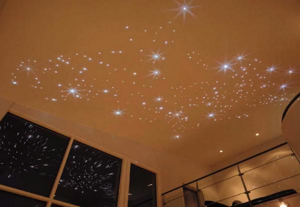 Натяжные потолки «Звёздное небо» — это настоящее произведение искусства. В зависимости от исполнения и выбранного рисунка, такой потолок может передавать как звездное небо с отдельными мерцающими звездами, так и целые галактики и созвездия. Устанавливаемая система подстветки позволяет регулировать мерцание и уровень яркости отдельных элементов так как вам будет комфортно. В качестве текстуры, как правило, используются тканевые основы.