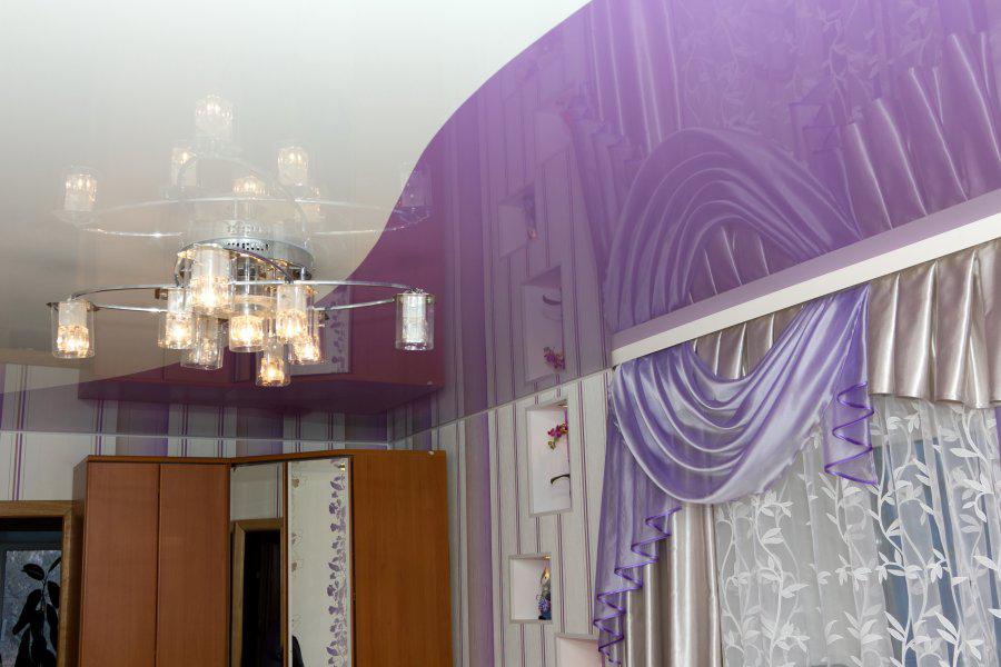 Чаще всего двухцветные натяжные потолки используются при двух или многоярусном исполнении, в случаях, когда исходный потолок другим способом спрятать не получается. Рекомендуется использовать близкие по характеру цвета или переход от более темного к более светлому оттенку одного и того же цвета, что позволит визуально увеличить пространство помещения.