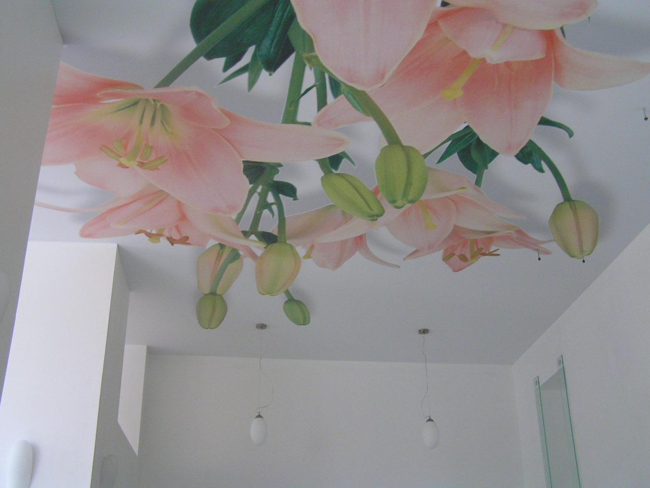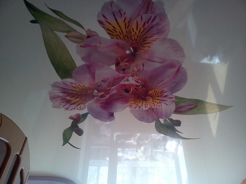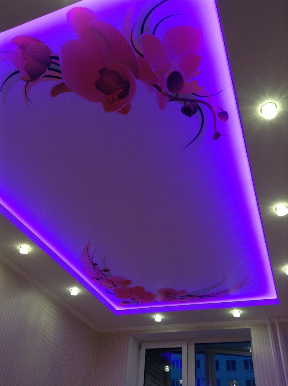 Каждый цветок несет особый смысл, и орхидея – символ люби и страсти. Подобный натяжной потолок, скорее всего, потребует хорошей освещенности и светлых тонов комнаты в целом. Поэтому лучшее сочетание – тканевый потолок со светодиодными лентами по периметру. Такой рисунок украсит не только гостиную, но и создаст уют в детской или спальной комнате.