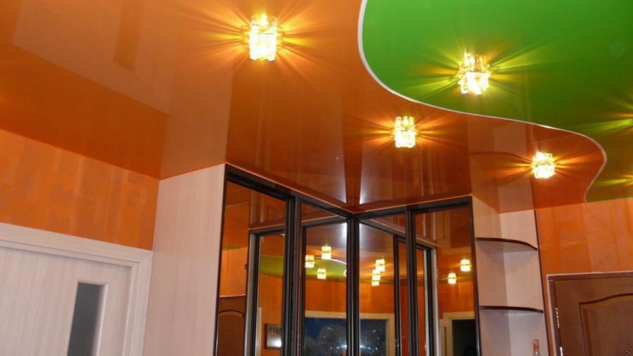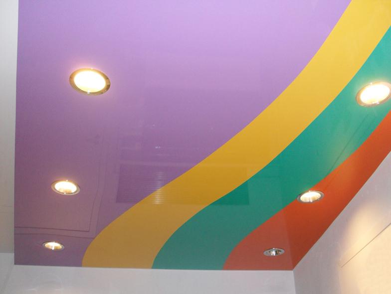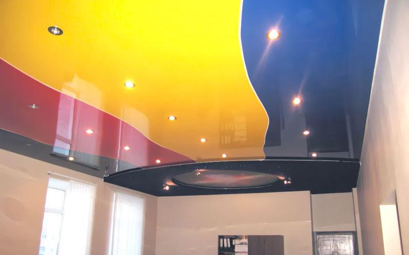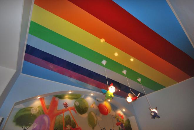 Если Вы установите такие натяжные потолки в спальне, то будете просыпаться с улыбкой. Разные сочетания могут подойти для всех типов помещения. Для детской рекомендуются более сдержанные и мягкие тона, для зала и спальни можно более насыщенные и пестрые, для кухни и прихожей – что-то темнее. Цветной натяжной потолок в рабочем кабинете поможет Вам время от времени отвлекаться от серьёзных задач и отдыхать.